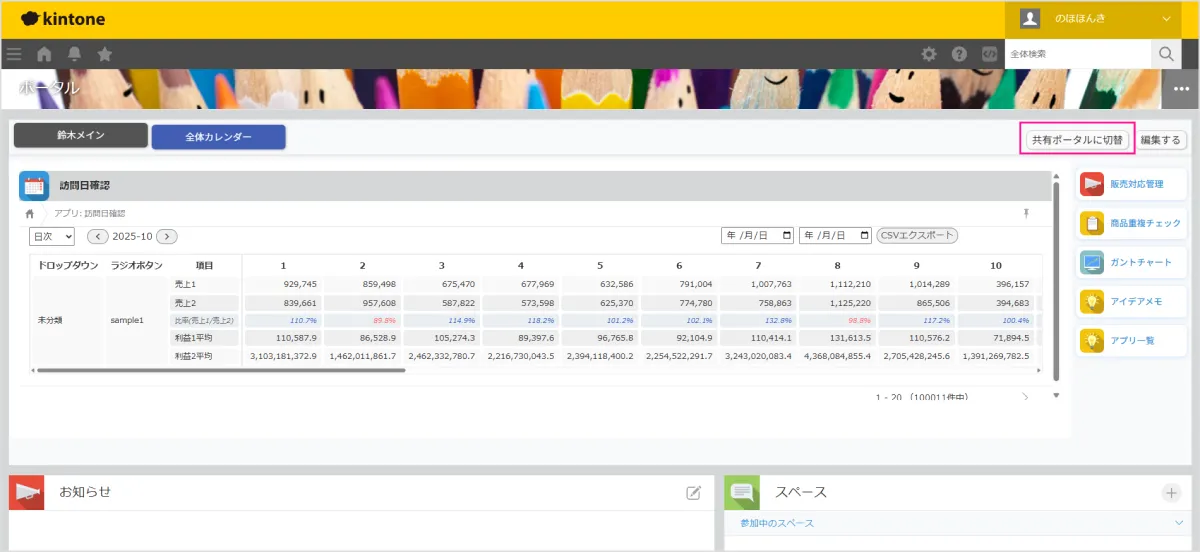 ■共有ポータルとは別に、自分専用のマイポータルも用意できます。初めてマイポータルを編集する際は、自動で共有ポータルの設定内容が複製されるので、そこから自由に編集を行います。マイポータル作成済みの場合には、初めにマイポータルが表示されるようになります。ポータル切替ボタンより、マイポータル↔共有ポータルを切り替えることができます。