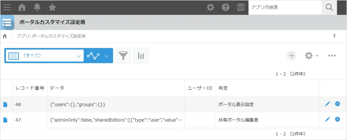 ■各ポータルカスタマイズ設定は、設定用アプリ内のレコードに自動で保存されます。基本的にレコードをメンテナンスする必要はありません(誤って削除してしまったり書き換えてしまうと、対応するポータル設定に影響が及びます)。