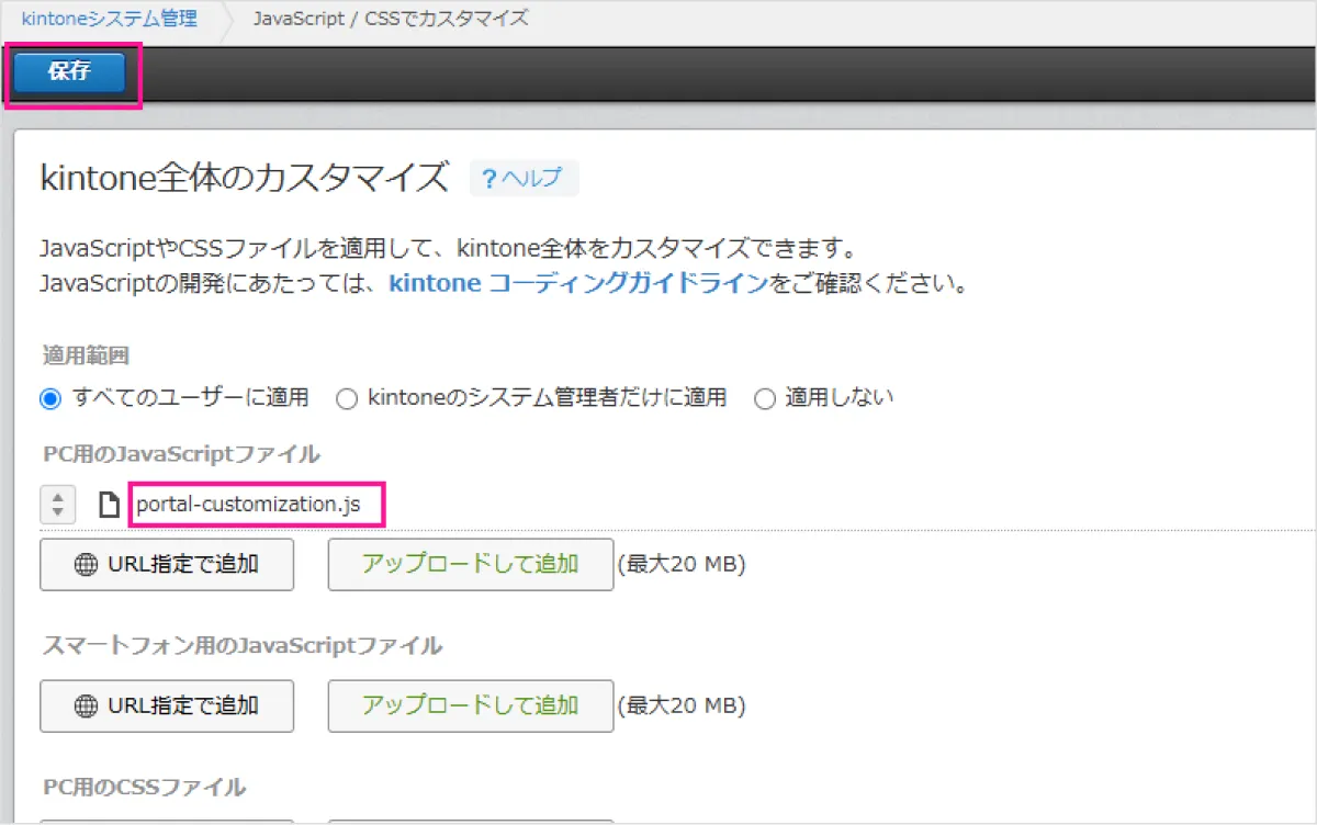 ■ダウンロードしたportal-customization.jsをアップロードし、設定を保存します。この作業は初回設定時またはプラグインのバージョンアップが行われた場合に必要です。