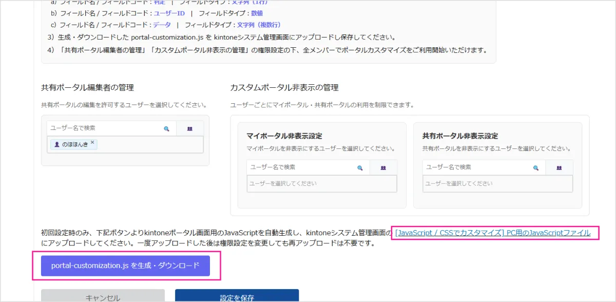 ■プラグイン設定画面の「portal-customization.js を生成・ダウンロード」ボタンをクリックすると、該当アプリID等が自動で埋め込まれたportal-customization.jsファイルがダウンロードされるので、青文字のリンク部分から設定ページに移動します。